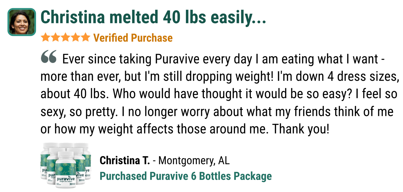 Be confident in your choice—each Puravive bottle is supported by our personal 180-day 100% money-back guarantee. If you find yourself unsatisfied with your results for any reason, feel free to return all bottles, even if empty, and receive a full and unconditional refund.